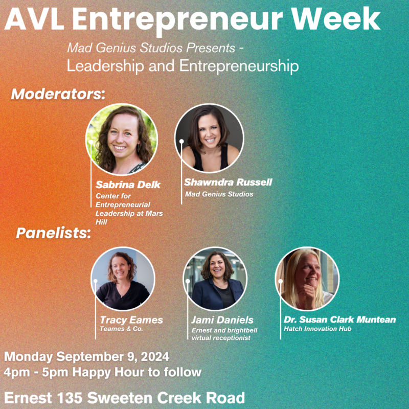 Join us and Mad Genius Studios on Monday, September 9th to talk Leadership and Entrepreneurship as part of Asheville Entrepreneurship Week. Stay for a little networking with a cold one.